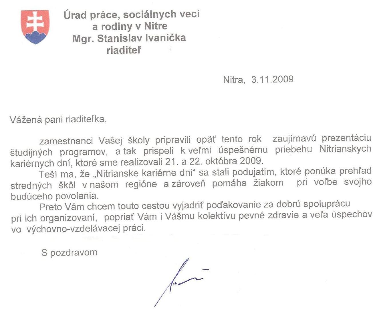 Zvlášť chcem poďakovať Vašim zamestnancom, ktorí pripravili zaujímavú prezentáciu študijných programov. Takýto prístup je pre nás povzbudením spolupracovať s Vašou školou i naďalej. Dovoľte mi popriať Vám i Vášmu kolektívu pevné zdravie a veľa úspechov vo vzdelávacej práci.